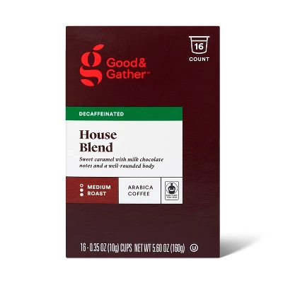 Whether you’re starting your day with a familiar flavor, or looking for an afternoon cup that won’t keep you up all night, Good & Gather™ Decaf House Blend Coffee offers the delicious flavor you love in a decaffeinated option. This medium roast coffee is made with Fair Trade Certified™ Arabica beans from South America, and it offers a well-rounded body with notes of sweet caramel and citrus and a pleasant brown sugar finish. With 16 convenient single-serve pods, it’s quick and easy to prepare a cup that you can enjoy hot or cold. Plus, Good & Gather™ single serve pods are easy to recycle thanks to EcoCup® packaging, which is translucent, recyclable and BPA free.