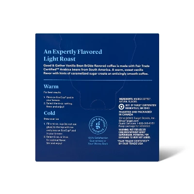Start your morning off right with a delicious, decadent cup of Naturally Flavored Vanilla Bean Brulee Light Roast Coffee from Good & Gather™. Fair Trade Certified™ Arabica beans from South America deliver a warm, sweet vanilla flavor with hints of caramelized sugar to create an enticingly smooth coffee. Complete with 16 or 48 single serving pods, you can brew the perfect amount of jo just for yourself — whether it be a hot cup of coffee or brewed over ice to create your own chilled beverage. Don’t be afraid to step into the role of barista by doctoring up your cup with your favorite flavored creamers, alternative milks, spices and more for a brimming cup of flavor. When you’re done crafting your masterpiece, it’s easy to recycle the single serve pod, thanks to the translucent, recyclable and BPA-free EcoCup® packaging.