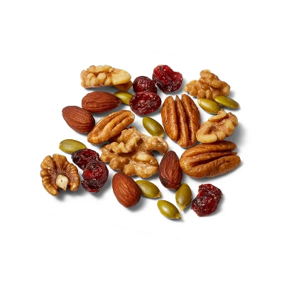 - Good & Gather trail mix with dried sweetened cranberries, almonds, raw walnut pieces, pepitas and raw pecan halves
