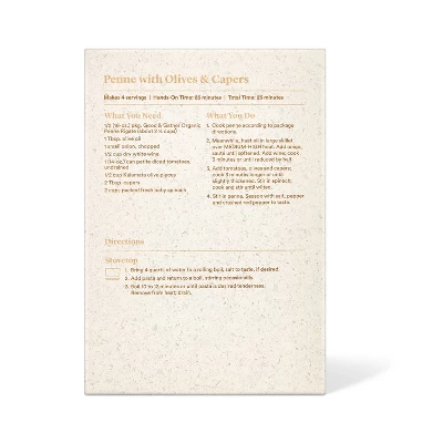 No matter what your favorite pasta dish is, you’ll love whipping it up with Organic Penne Rigate from Good & Gather™. This organic pasta is made from organic durum semolina. Create a hearty meat-based pasta dish by topping off the penne with a rich, garlicky red sauce, meatballs, basil and mozzarella, bring a touch of the sea to your pasta with Alfredo sauce, shrimp, capers and a spritz of lemon, or keep things simple with olive oil and Parmesan cheese. This organic pasta is also made with no artificial colors, flavors or preservatives.