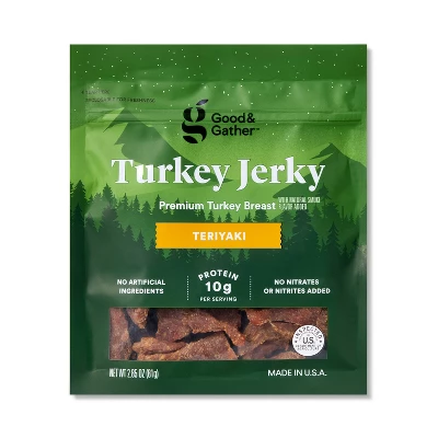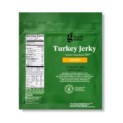Teriyaki Turkey Jerky from Good & Gather™ is a delicious way to refuel after a workout or stay fueled on the trails. A great alternative to beef jerky for those who don’t eat red meat, this turkey jerky is made from premium turkey breast with no artificial ingredients. Premium turkey breast is given a tasty punch from added teriyaki flavor, without any nitrates or nitrites added*. With 10 grams of protein per serving and 97 percent fat free, this teriyaki jerky is a great way to enjoy a flavorful snack. Stash it in your hiking backpack, gym bag or office desk drawer to easily reach for whenever you need a munch.