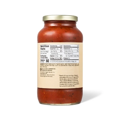 This Traditional Pasta Sauce with No Sugar Added from Good & Gather™ is a versatile sauce you can use to whip up quick and tasty dinners on busy weeknights. This classic tomato-based sauce with spices is made with no artificial colors or flavors and no sugar added, so you can feel good about serving it to the whole family. Perfect for pasta, meatballs, chicken Parmesan and more, you get 1.5 servings of vegetables per 1/2 cup of this tasty sauce.